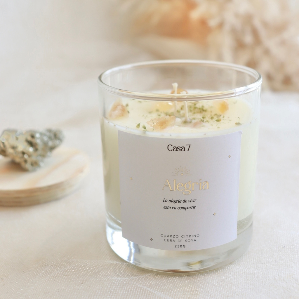 Vela a base de soya 100% natural con aromas cítricos de notas frescas, acompañada de cuarzo citrino.